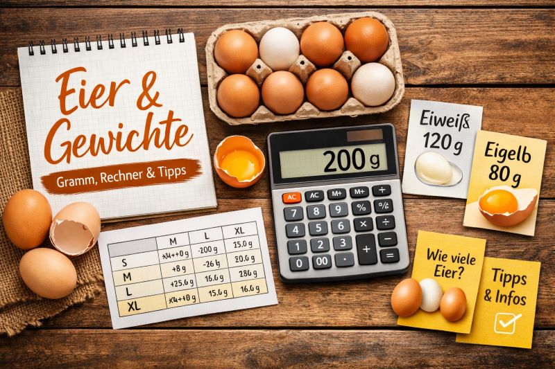 Warum können Zahlen abweichen? Naturprodukte schwanken. Größe, Fütterung, Frische und auch die Dicke der Schale beeinflussen das Ergebnis. Die Rechner sind deshalb ideal zum Planen und Umrechnen, ersetzen aber nicht das Wiegen, wenn ein Rezept wirklich empfindlich ist.